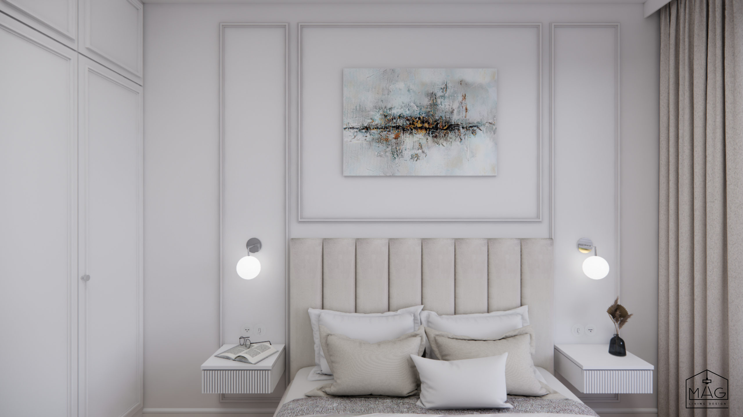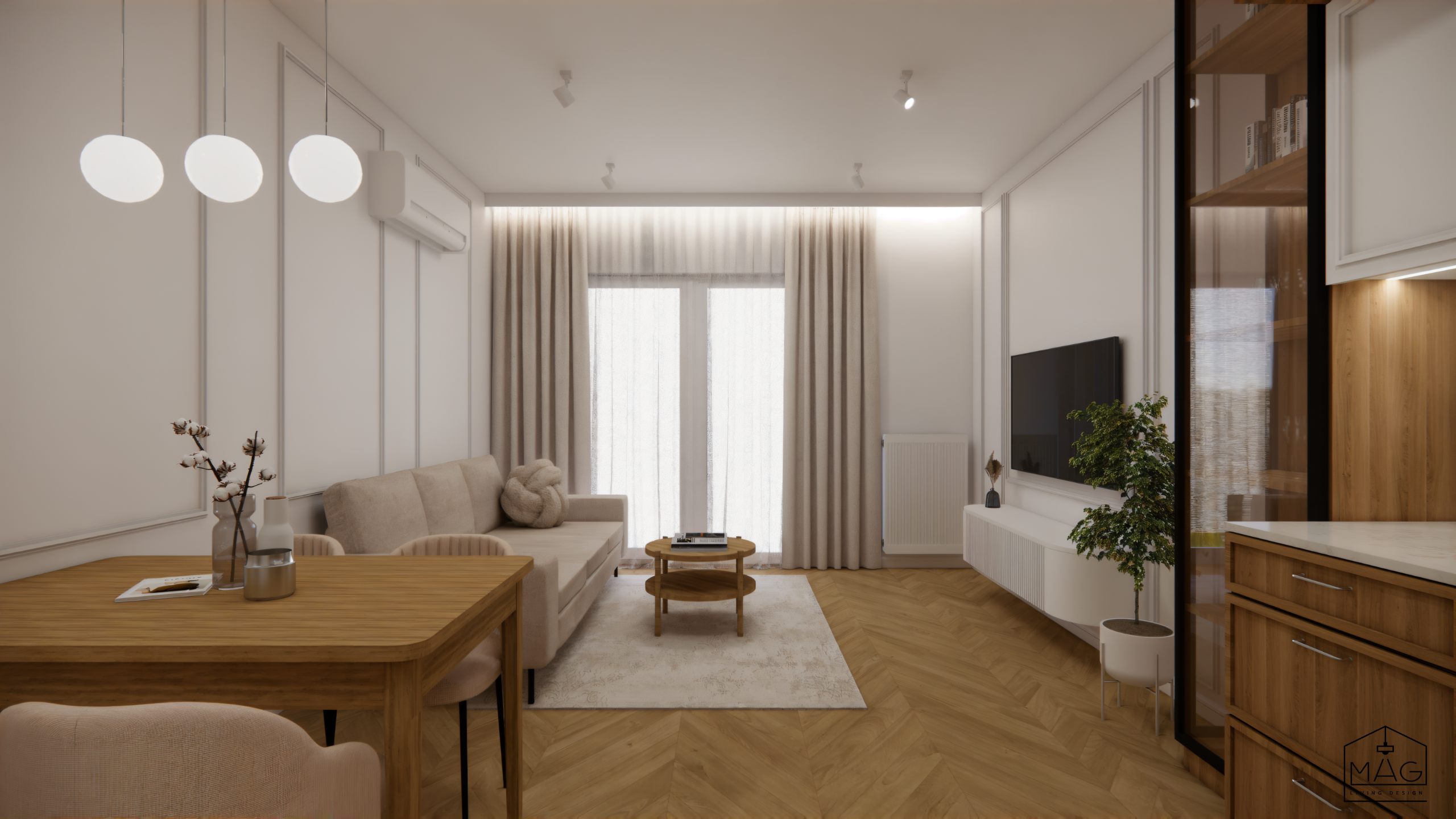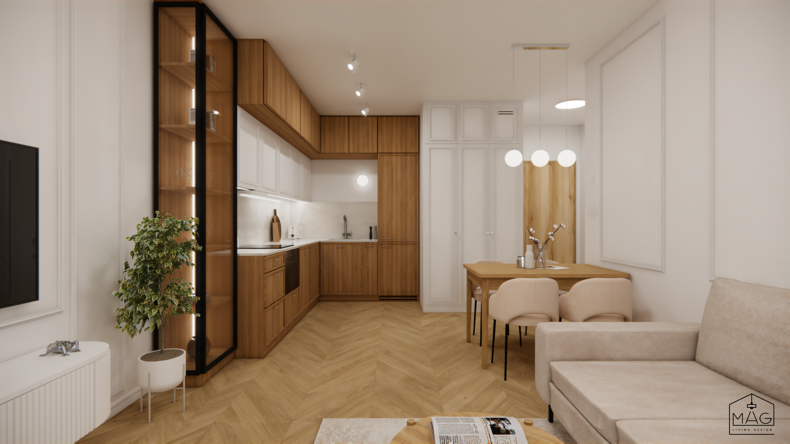Stylowe mieszkanie na Mokotowie (41 m²) zaprojektowane z myślą o wynajmie dla wymagającego klienta. Elegancka estetyka modern classic łączy ponadczasową klasę z funkcjonalnością, a wysokiej jakości materiały gwarantują trwałość i komfort. Jasna paleta barw, dekoracyjne detale i starannie dobrane oświetlenie tworzą wnętrze pełne harmonii i wyrafinowanego stylu, idealne dla najemcy premium.