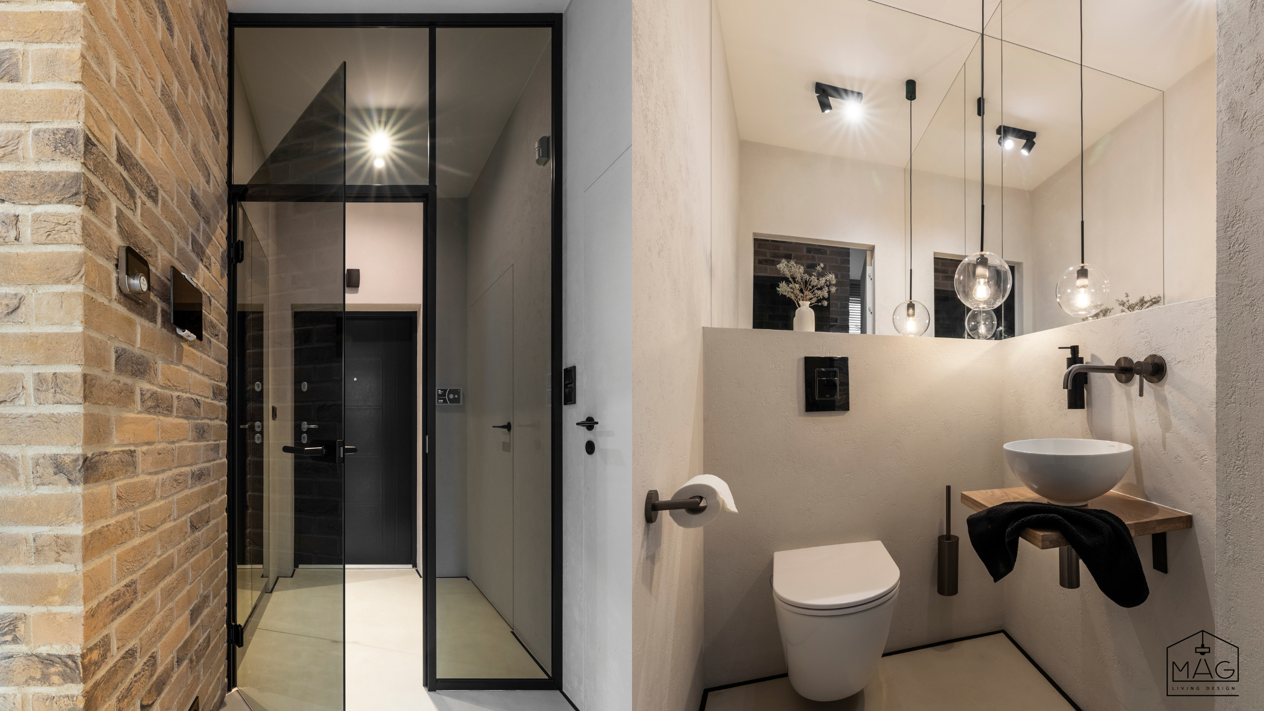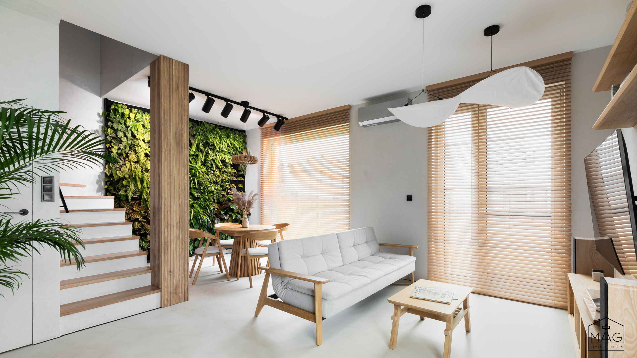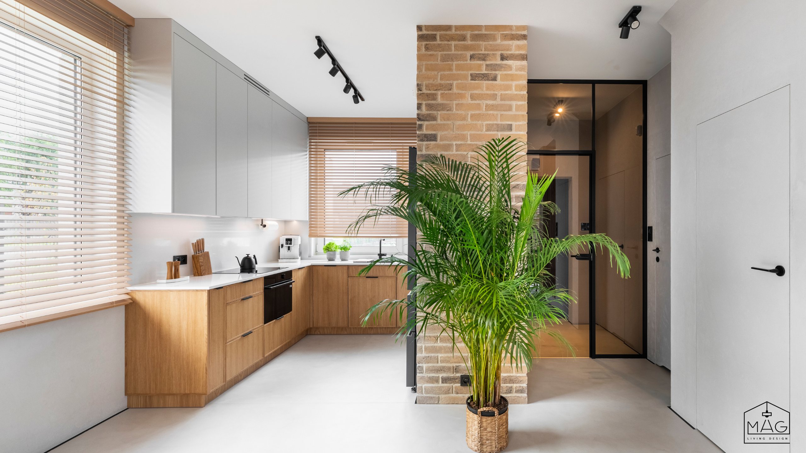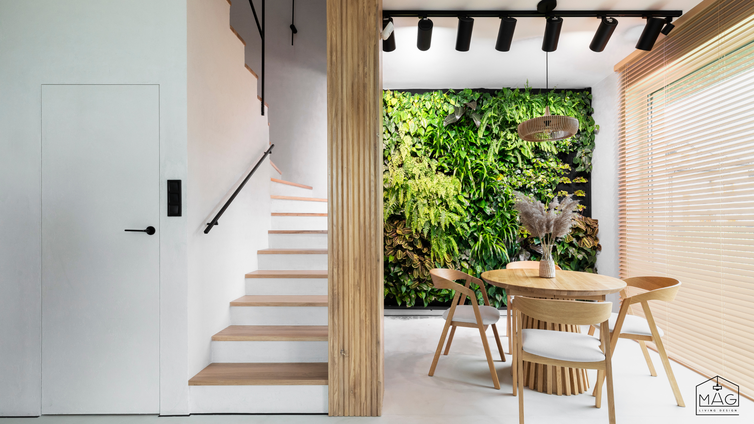 Stylowy bliźniak w Józefosławiu (90 m²) to harmonijne połączenie stylu japandi – minimalizmu i naturalnych materiałów. Wnętrza łączą mikrocement, drewno, cegłę i tynk strukturalny, tworząc ciepłą, przytulną atmosferę. Centralnym elementem jest zielona ściana z żywych roślin, dodająca wnętrzu świeżości. To przestrzeń zaprojektowana z myślą o estetyce, funkcjonalności i spokoju.