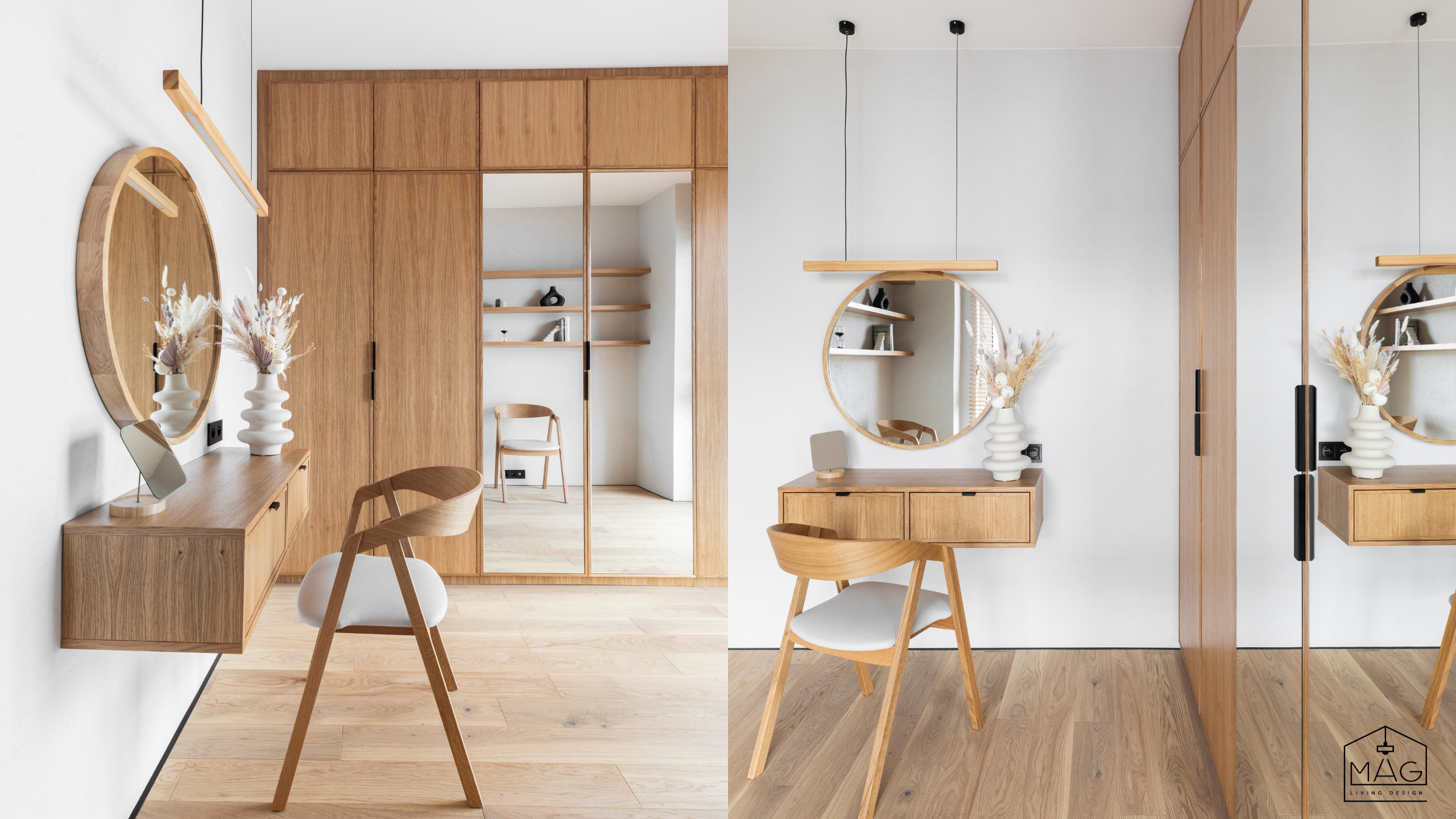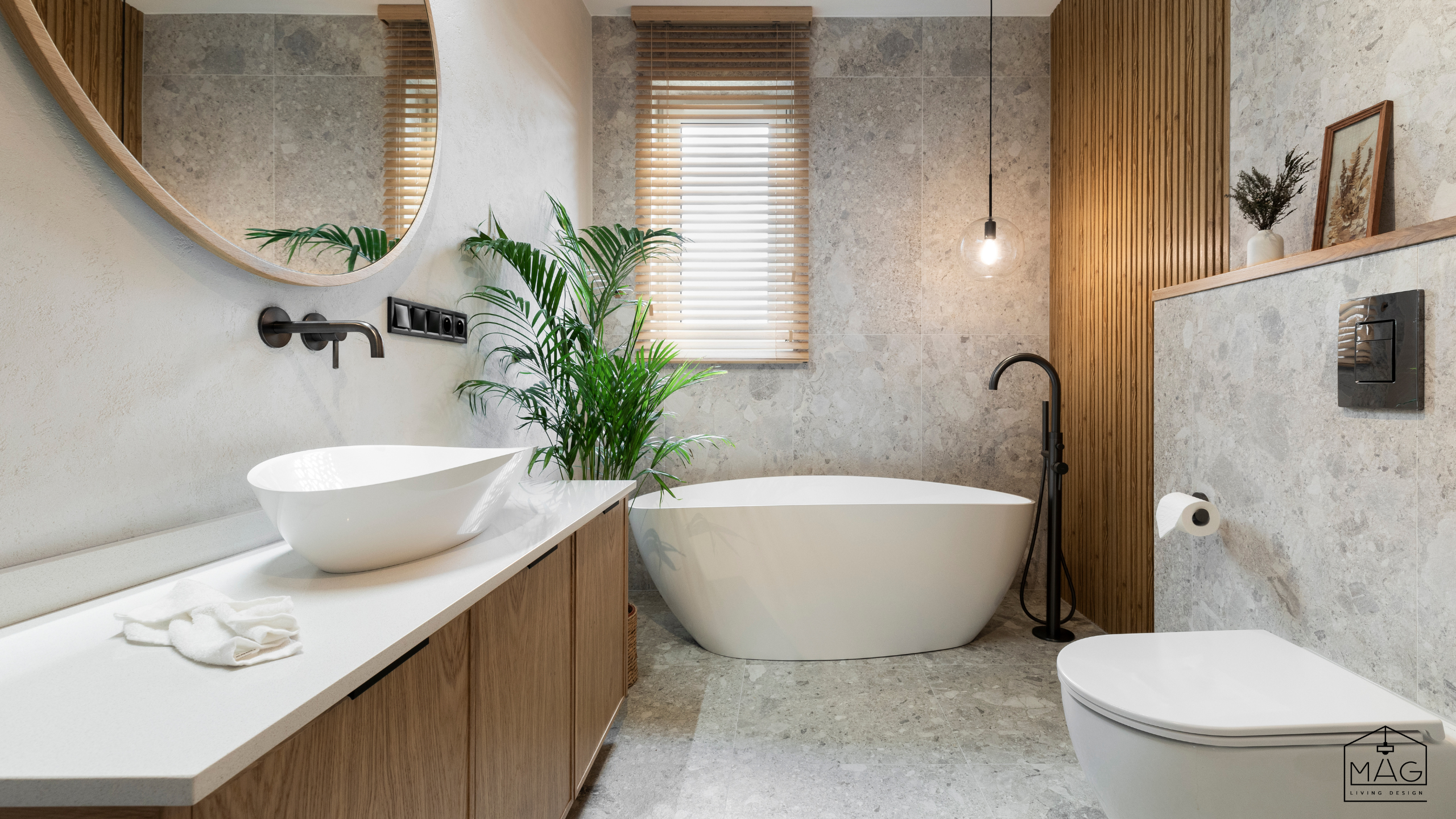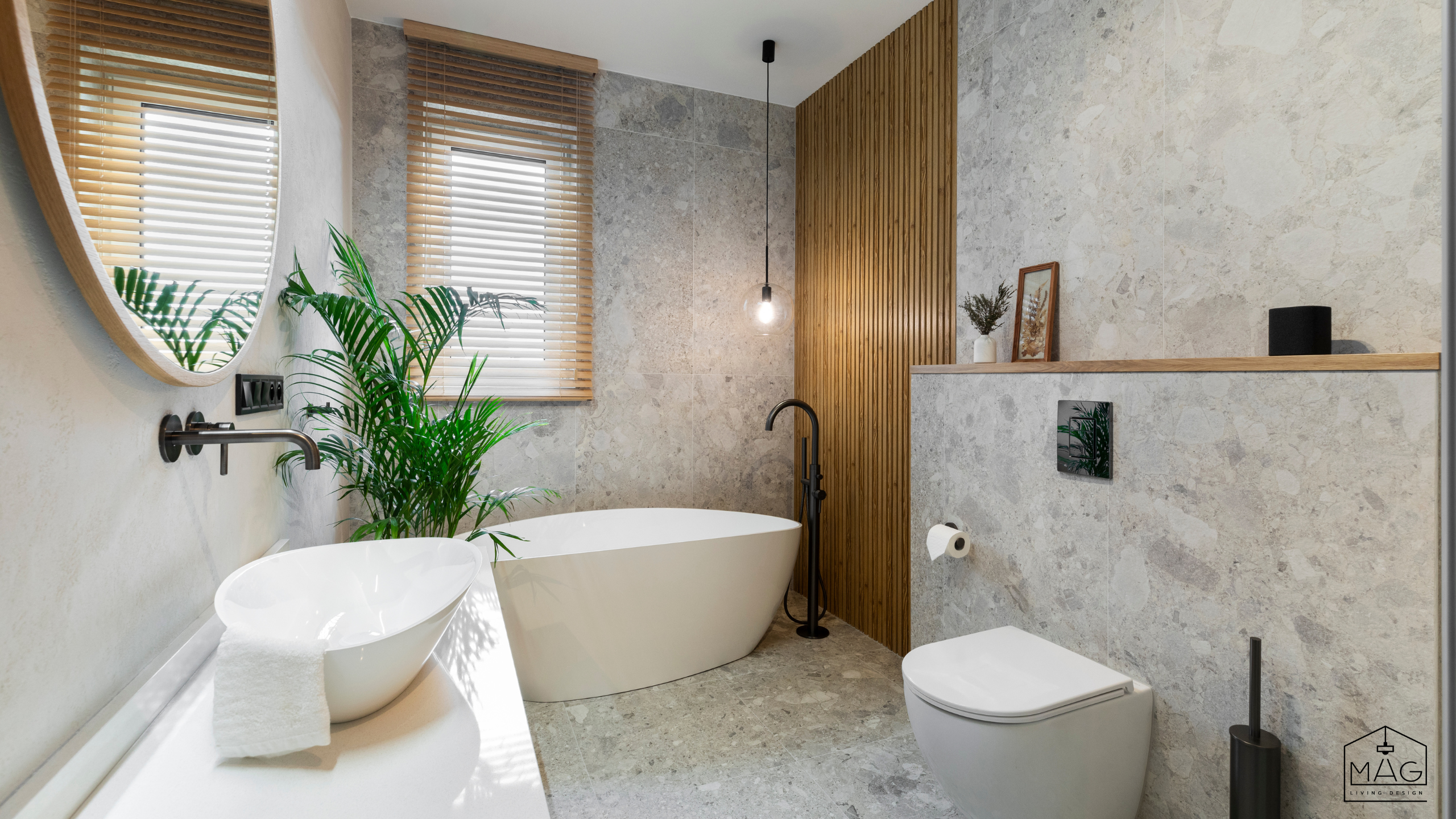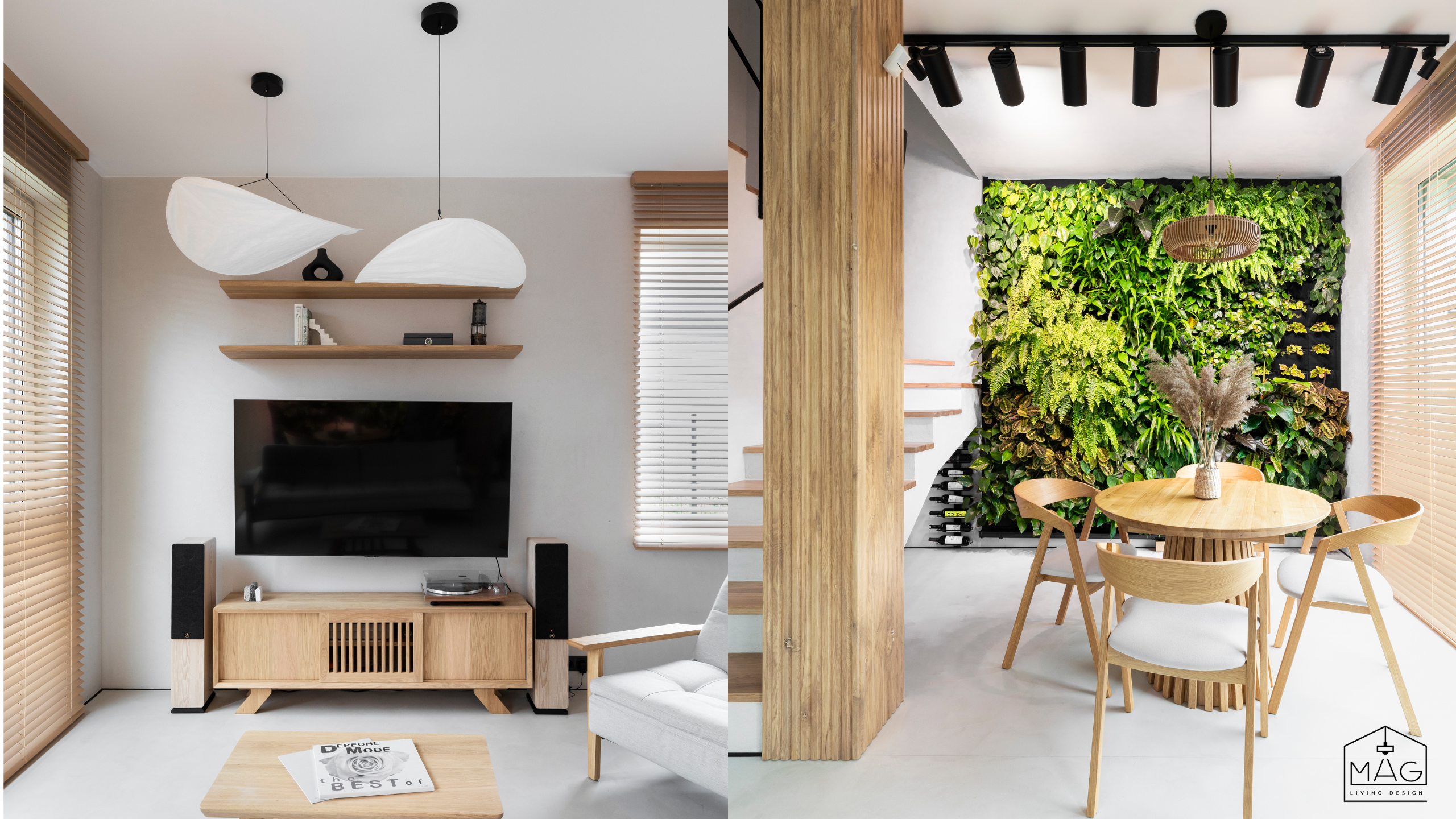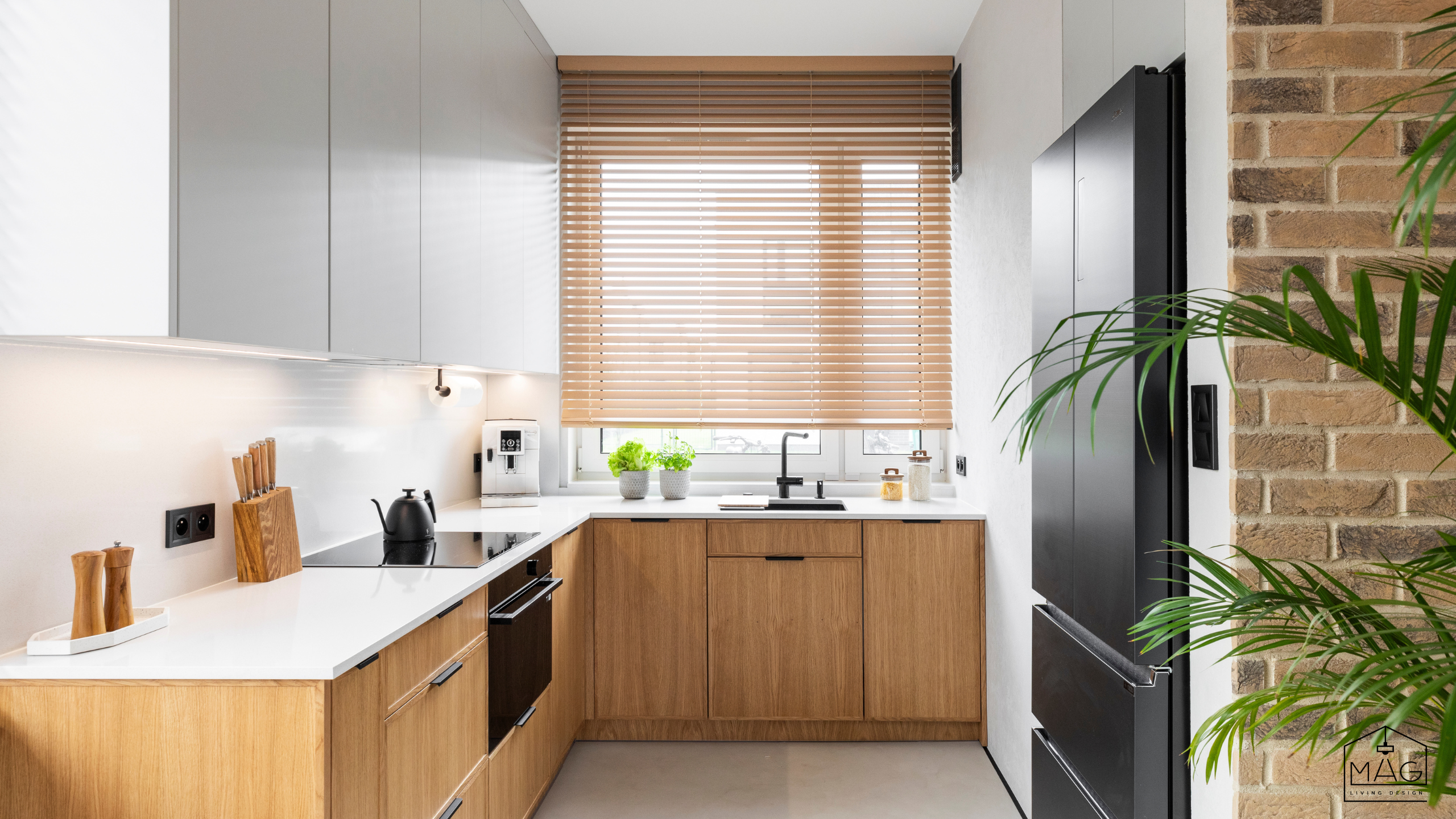Stylowy bliźniak w Józefosławiu (90 m²) to harmonijne połączenie stylu japandi – minimalizmu i naturalnych materiałów. Wnętrza łączą mikrocement, drewno, cegłę i tynk strukturalny, tworząc ciepłą, przytulną atmosferę. Centralnym elementem jest zielona ściana z żywych roślin, dodająca wnętrzu świeżości. To przestrzeń zaprojektowana z myślą o estetyce, funkcjonalności i spokoju.