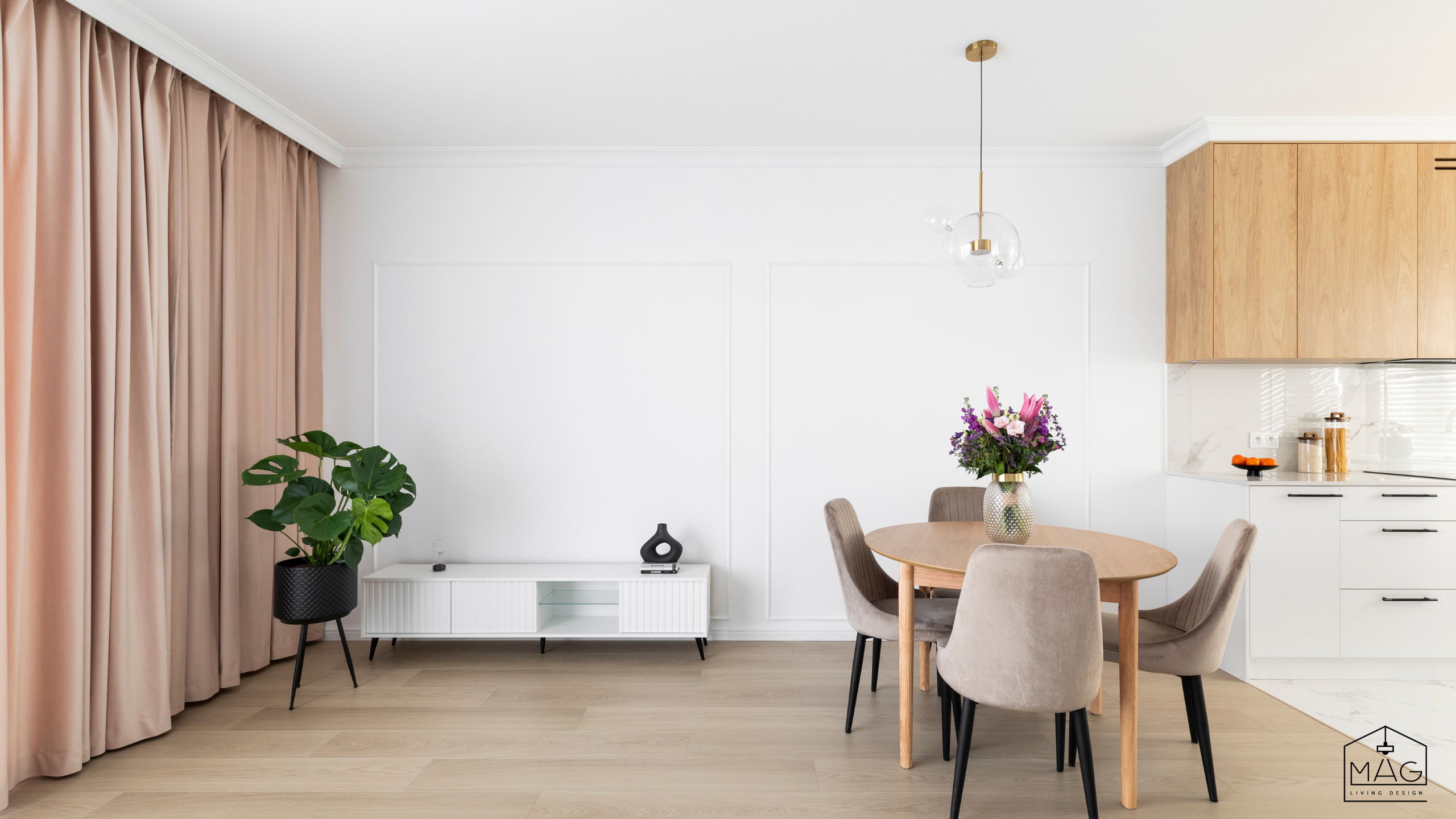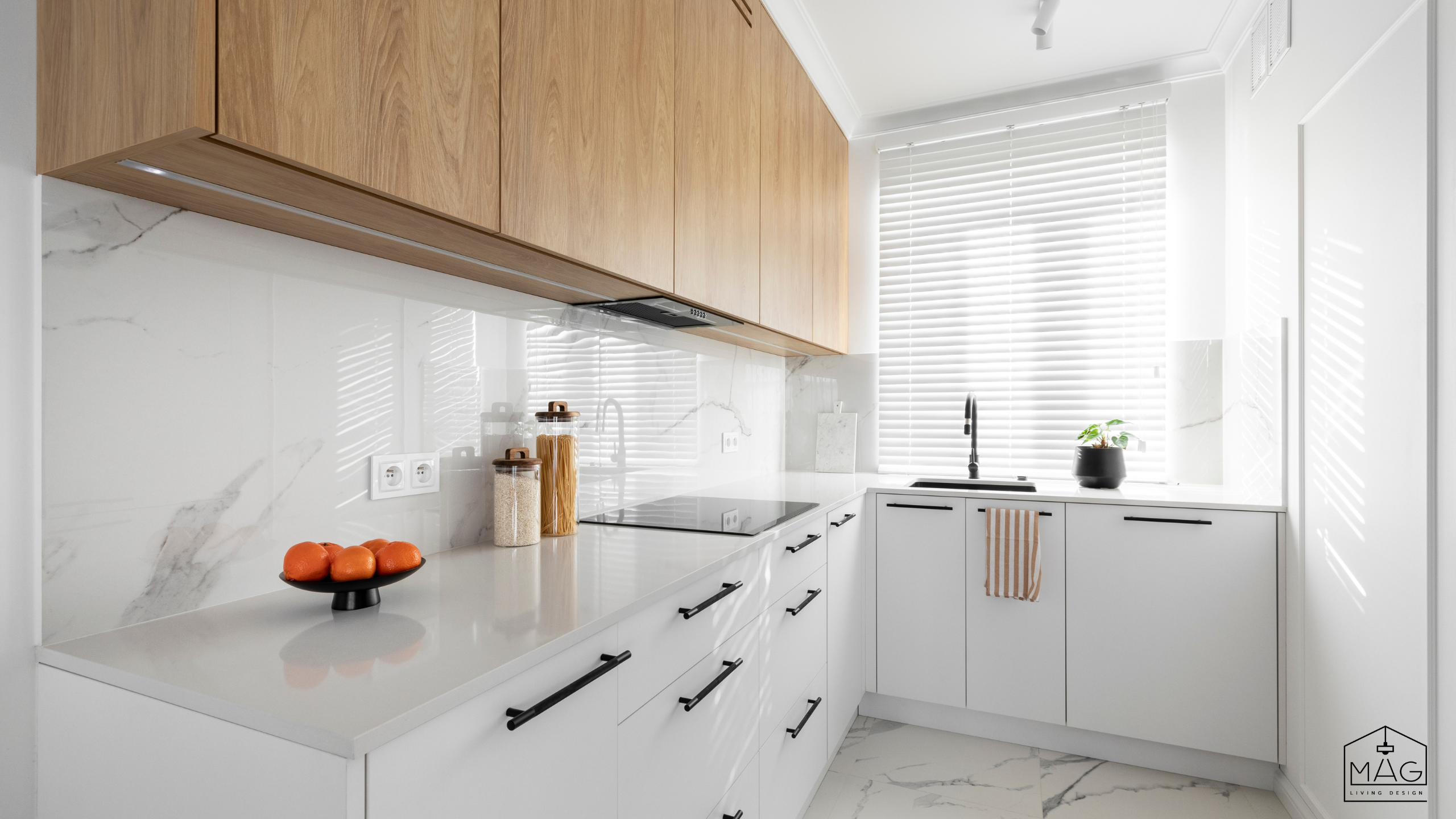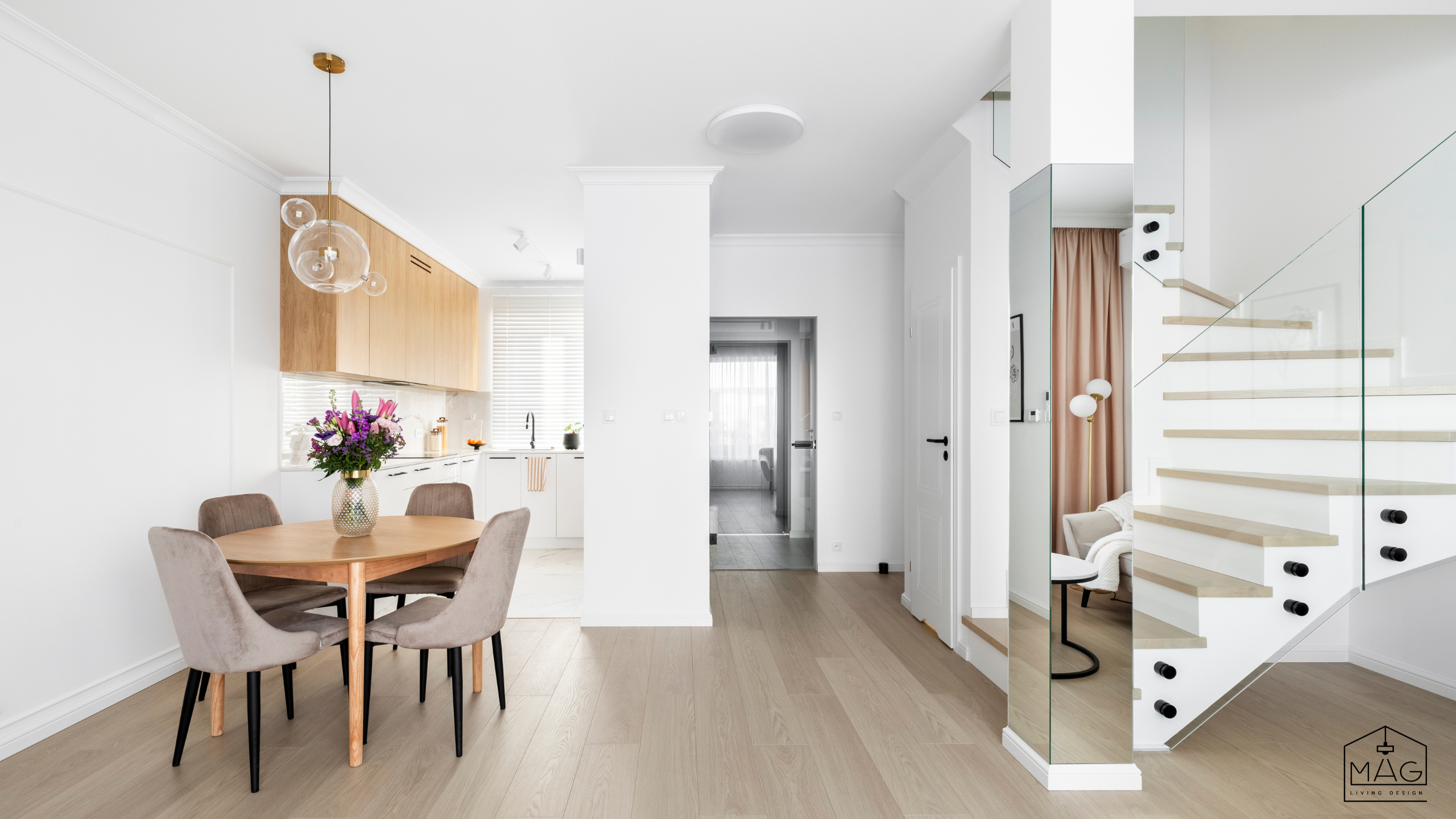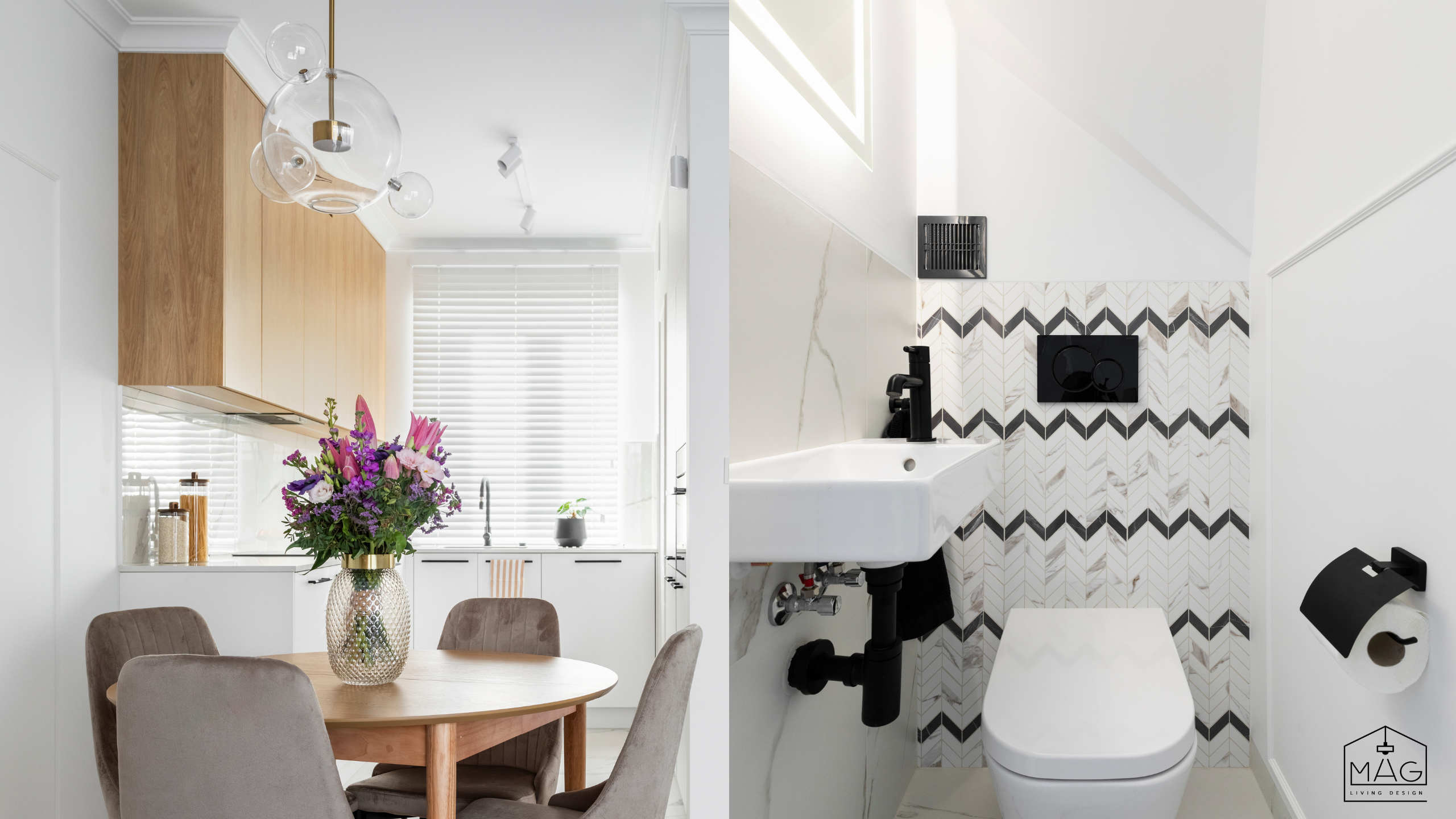 Funkcjonalny segment inwestycyjny (134 m²) zaprojektowany z myślą o wynajmie. Na 5 pokojach udało się stworzyć przemyślaną i estetyczną przestrzeń, łącząc budżetowe rozwiązania z trwałymi, wysokiej jakości materiałami, jak konglomeratowe blaty. Neutralna paleta barw – biel, drewno i czarne akcenty – nadaje wnętrzom nowoczesny, uniwersalny charakter, idealny dla szerokiego grona najemców.