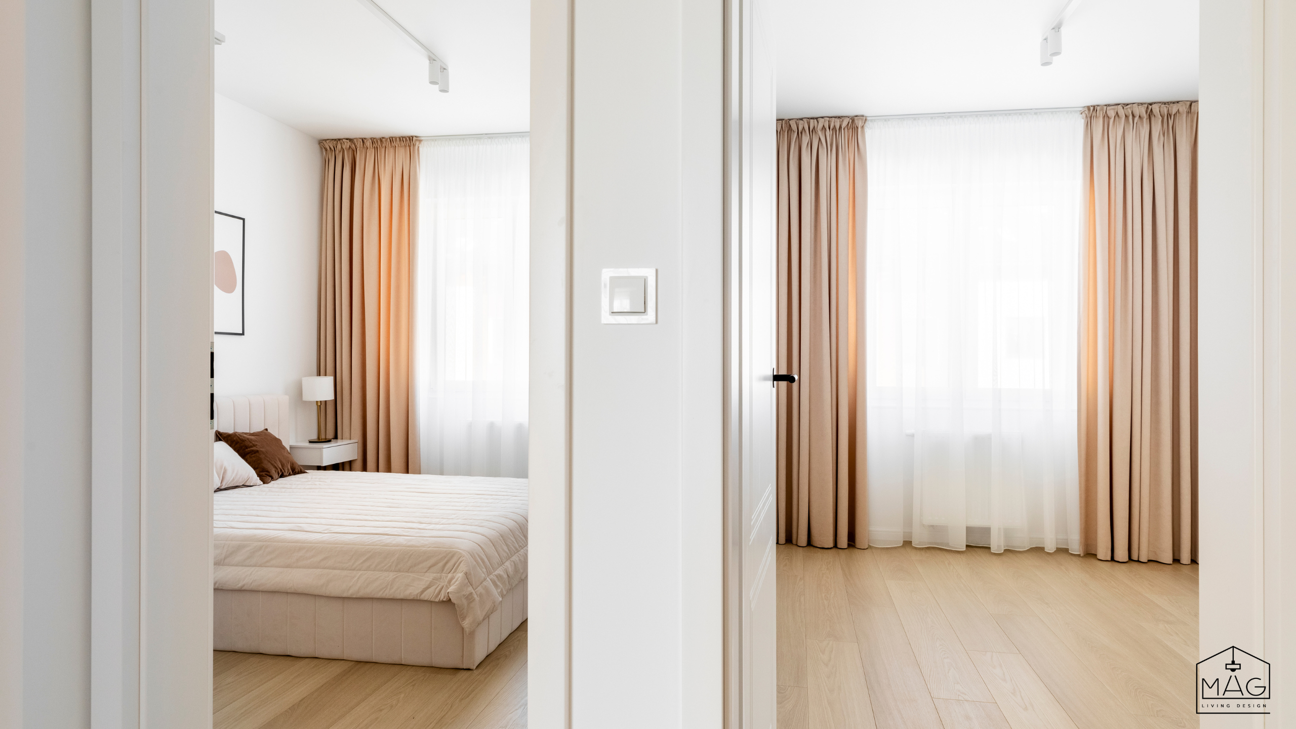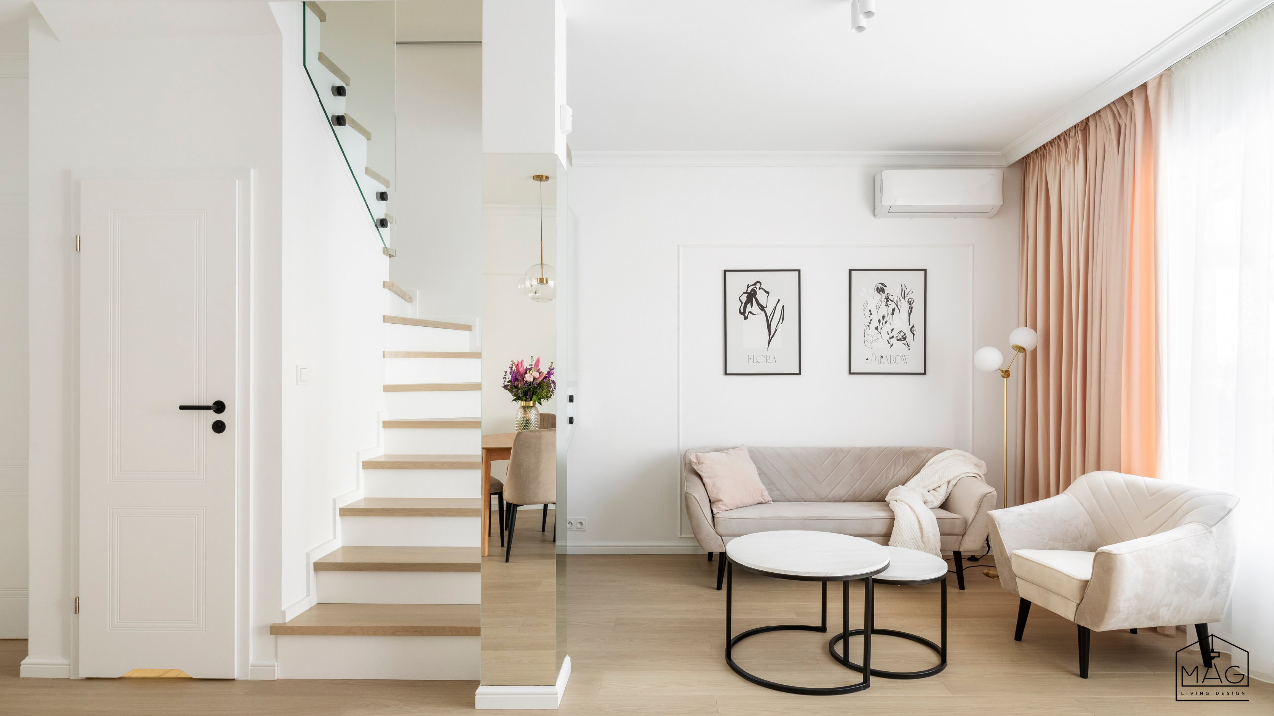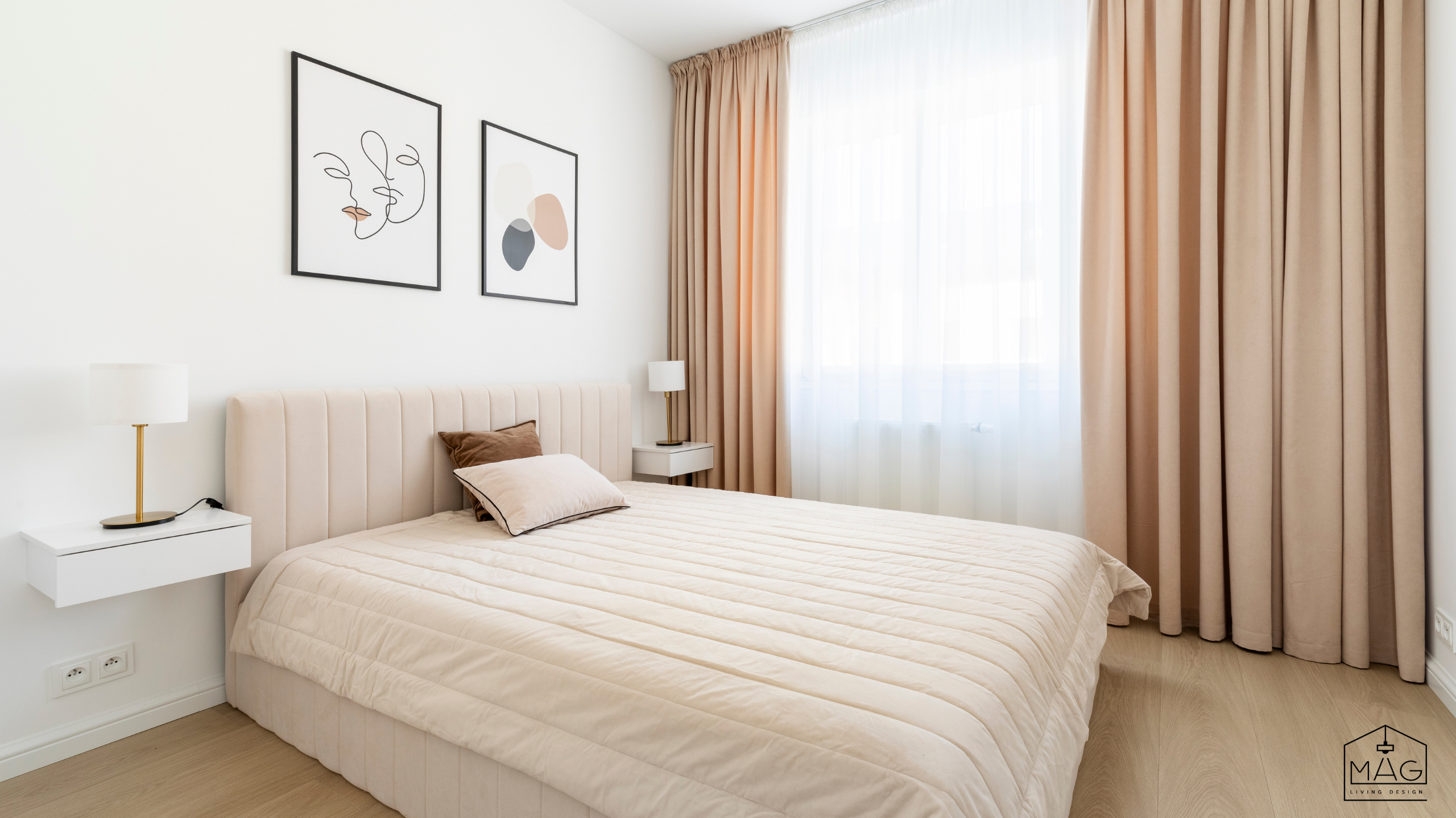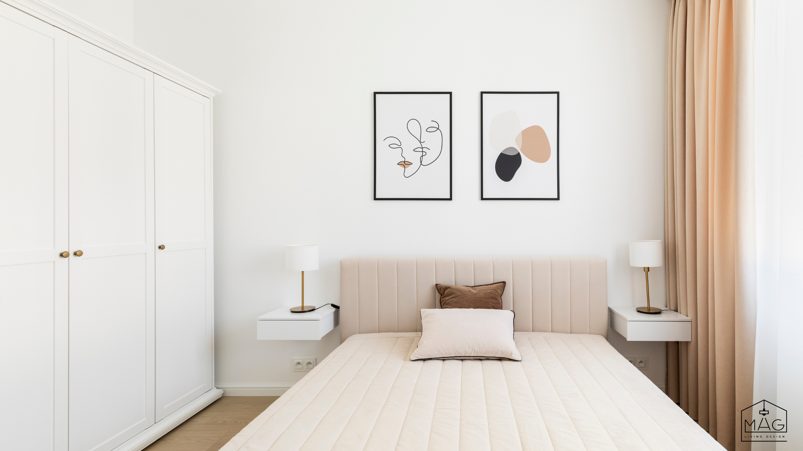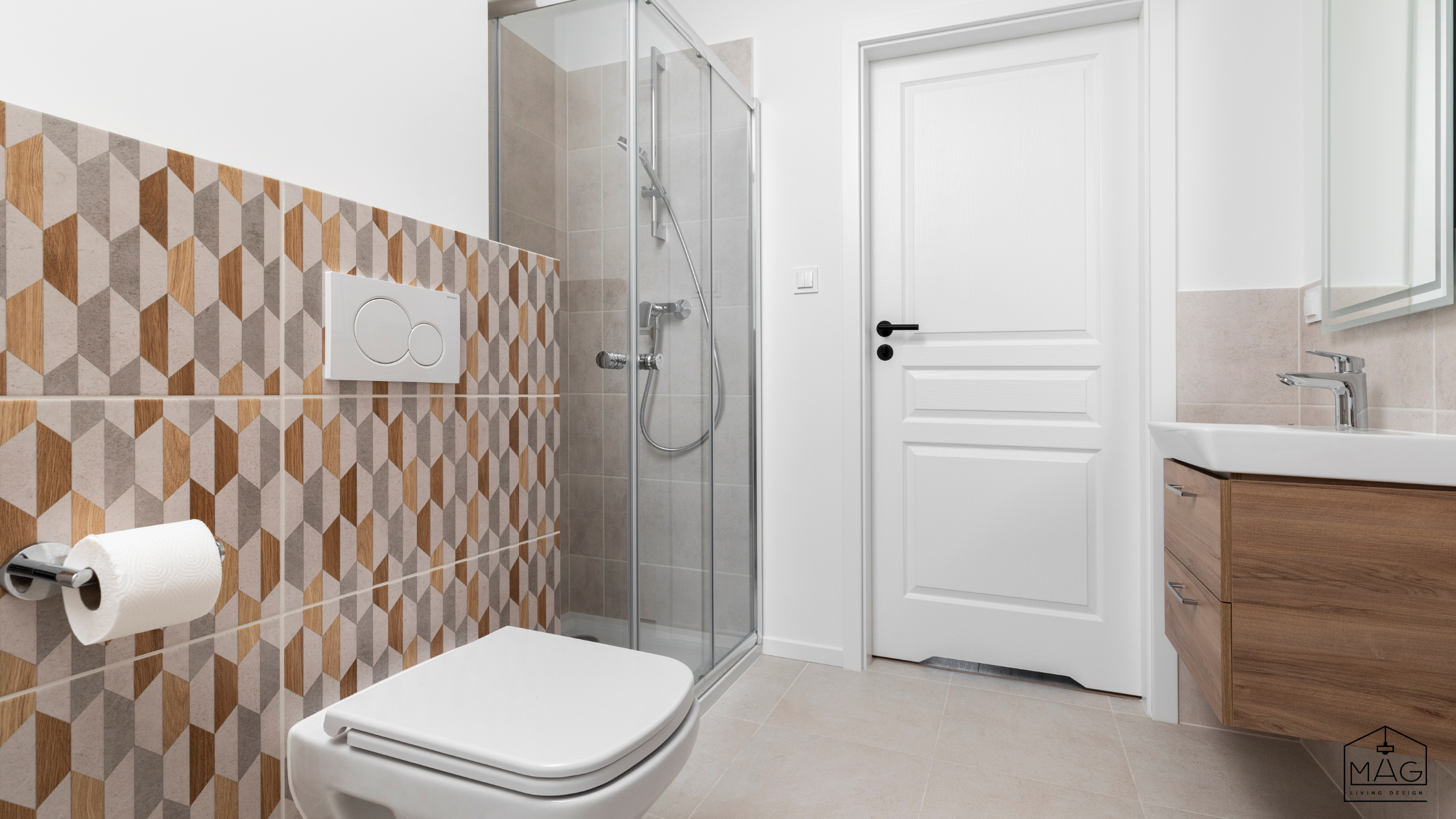 Funkcjonalny segment inwestycyjny (134 m²) zaprojektowany z myślą o wynajmie. Na 5 pokojach udało się stworzyć przemyślaną i estetyczną przestrzeń, łącząc budżetowe rozwiązania z trwałymi, wysokiej jakości materiałami, jak konglomeratowe blaty. Neutralna paleta barw – biel, drewno i czarne akcenty – nadaje wnętrzom nowoczesny, uniwersalny charakter, idealny dla szerokiego grona najemców.