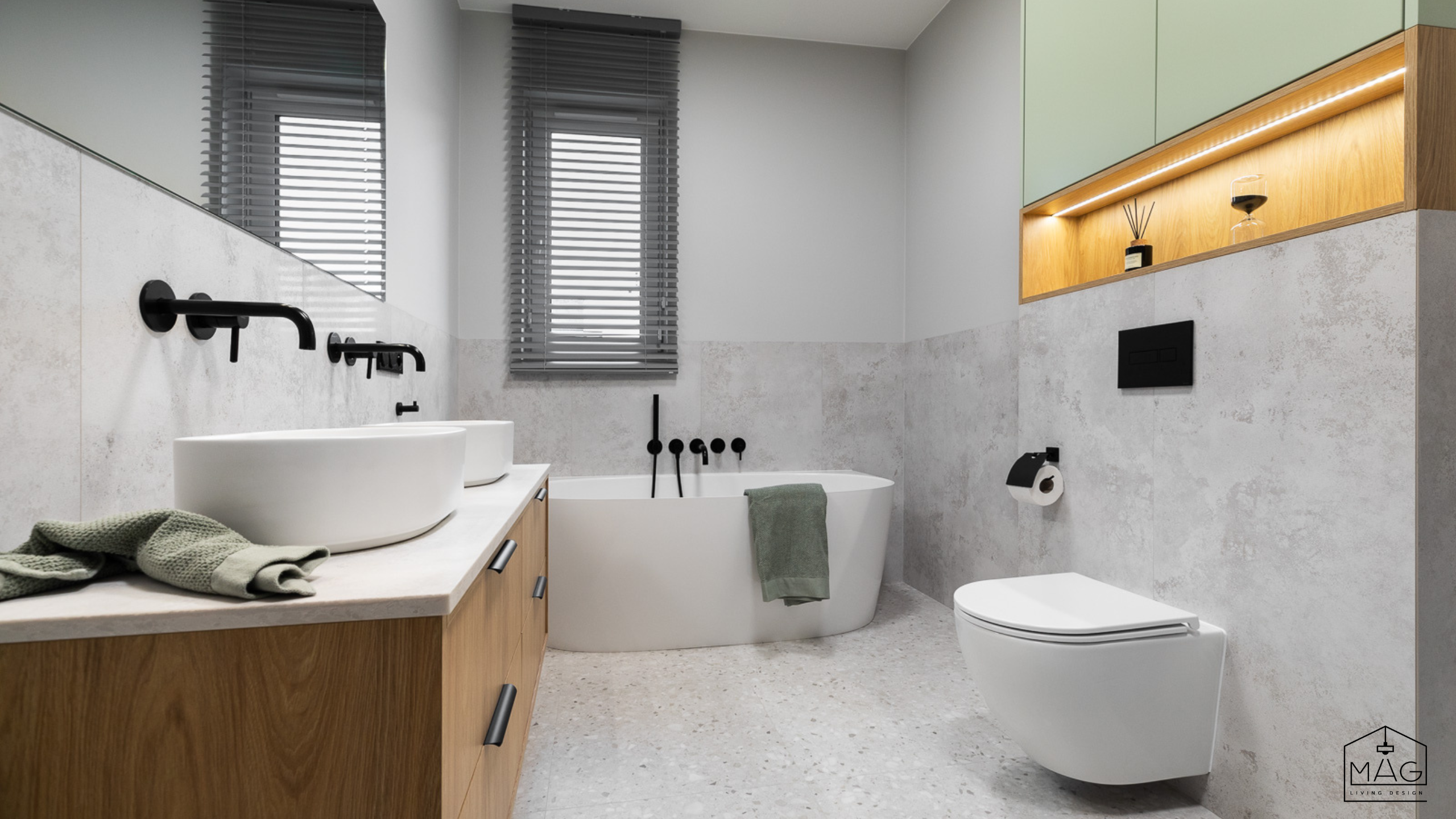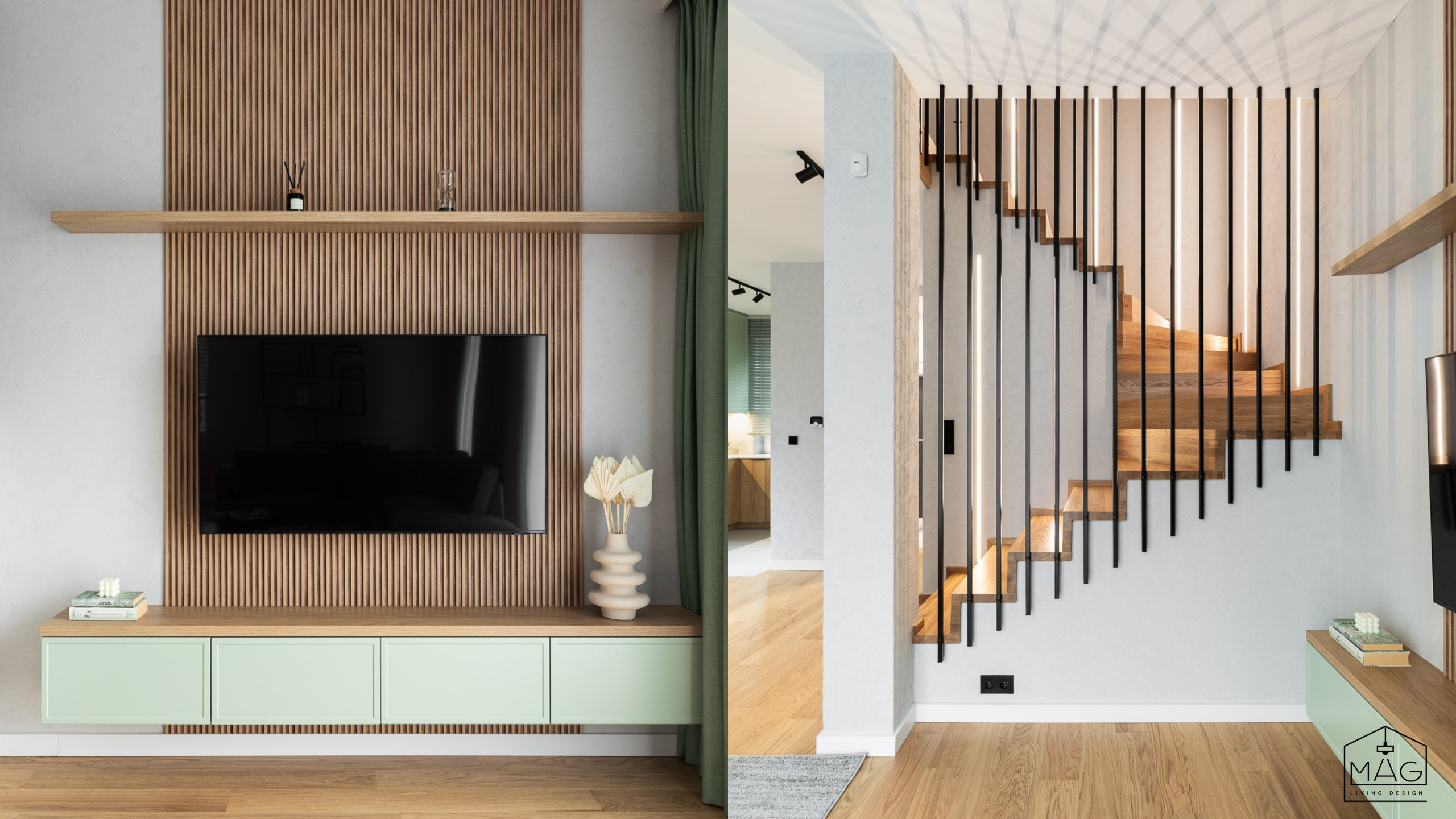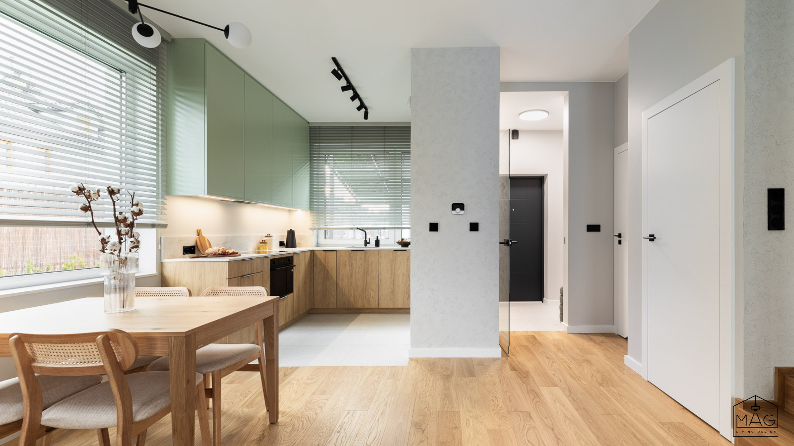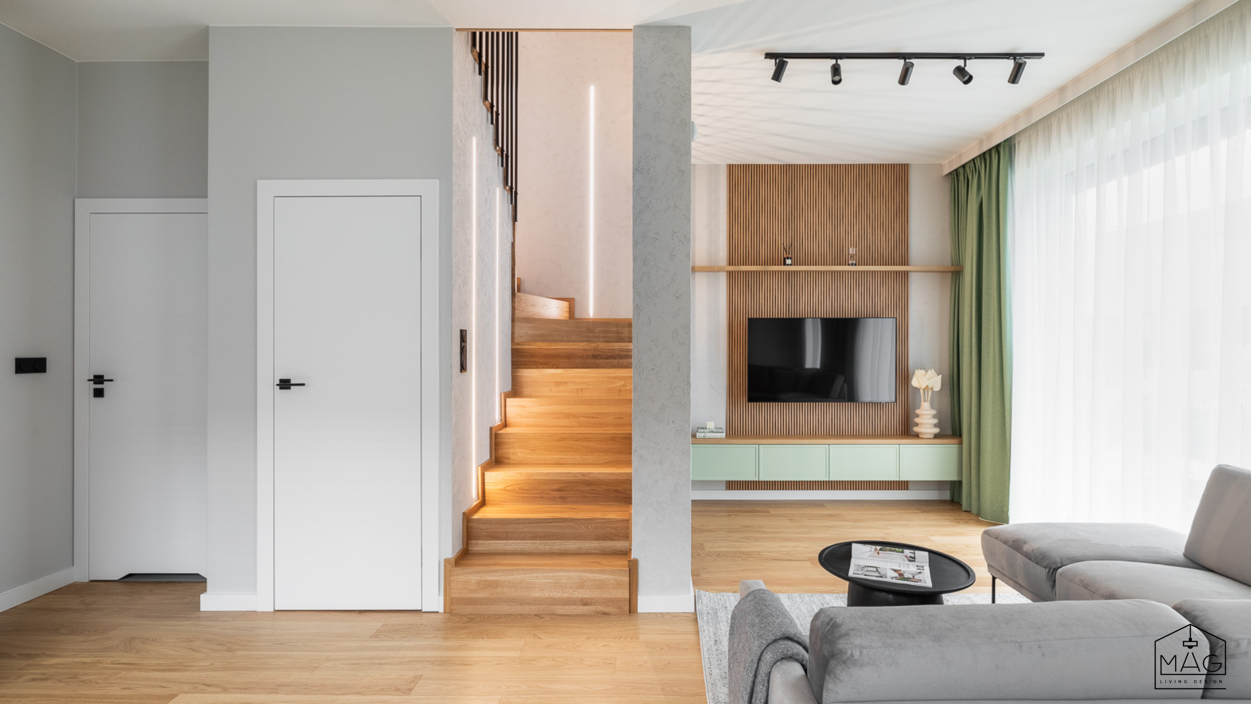 Nowoczesne i przytulne wnętrze bliźniaka (90 m²) stworzone z myślą o wynajmie. Połączenie ciepłych odcieni drewna, szałwii i szarości nadaje aranżacji harmonijny i uniwersalny charakter. Wysokiej jakości materiały, eleganckie blaty z konglomeratu oraz strukturalne tynki ścienne podkreślają dopracowany styl. Nastrojowe oświetlenie LED dodaje głębi i nowoczesnego akcentu. Modnie, ale neutralnie – idealnie dopasowane do szerokiego grona najemców.