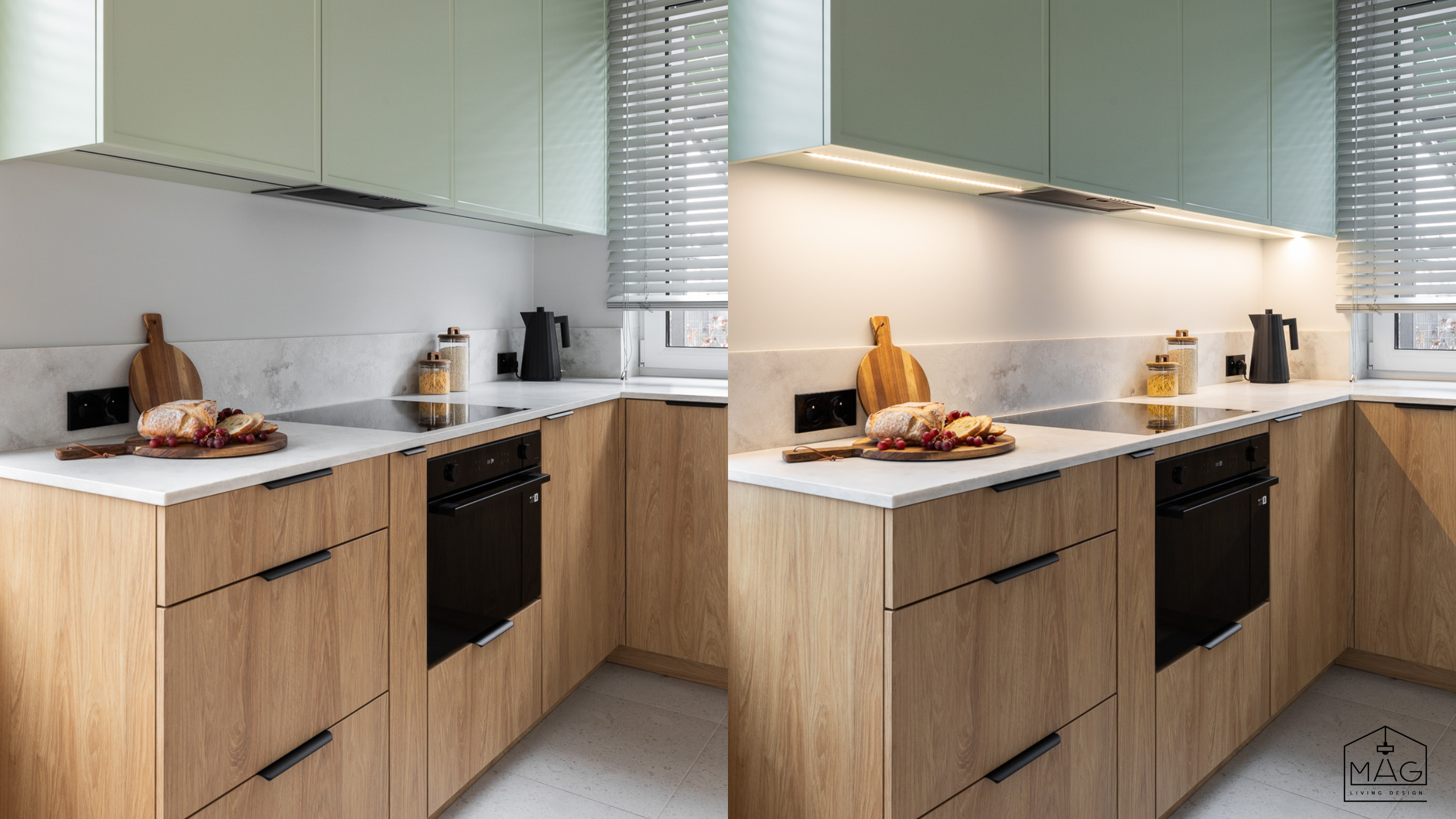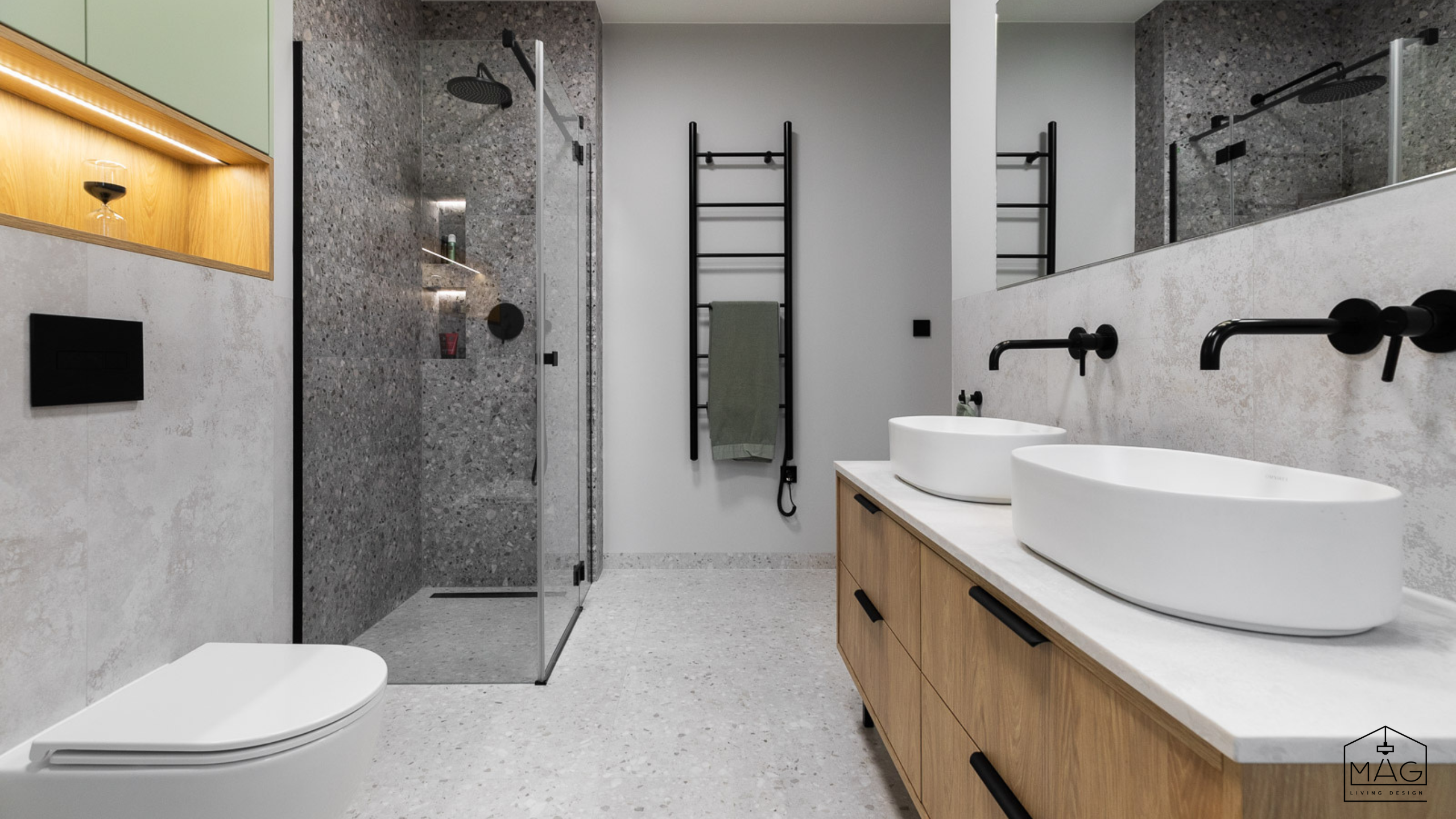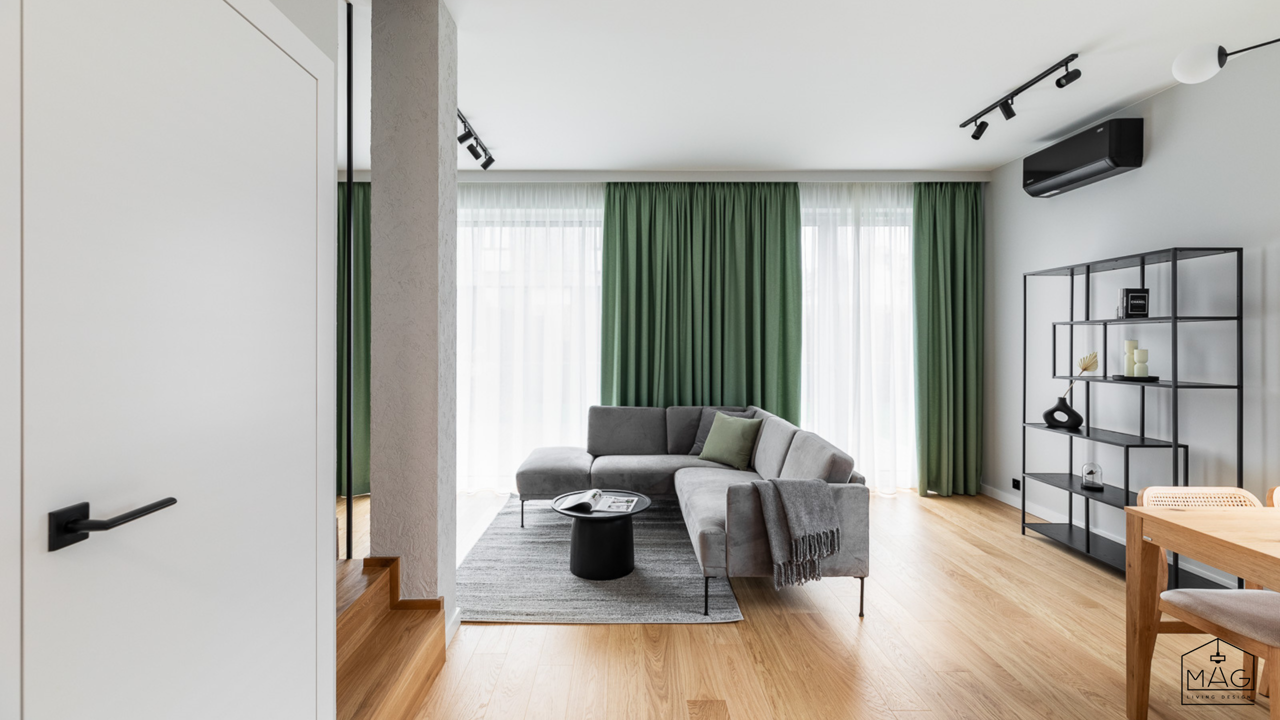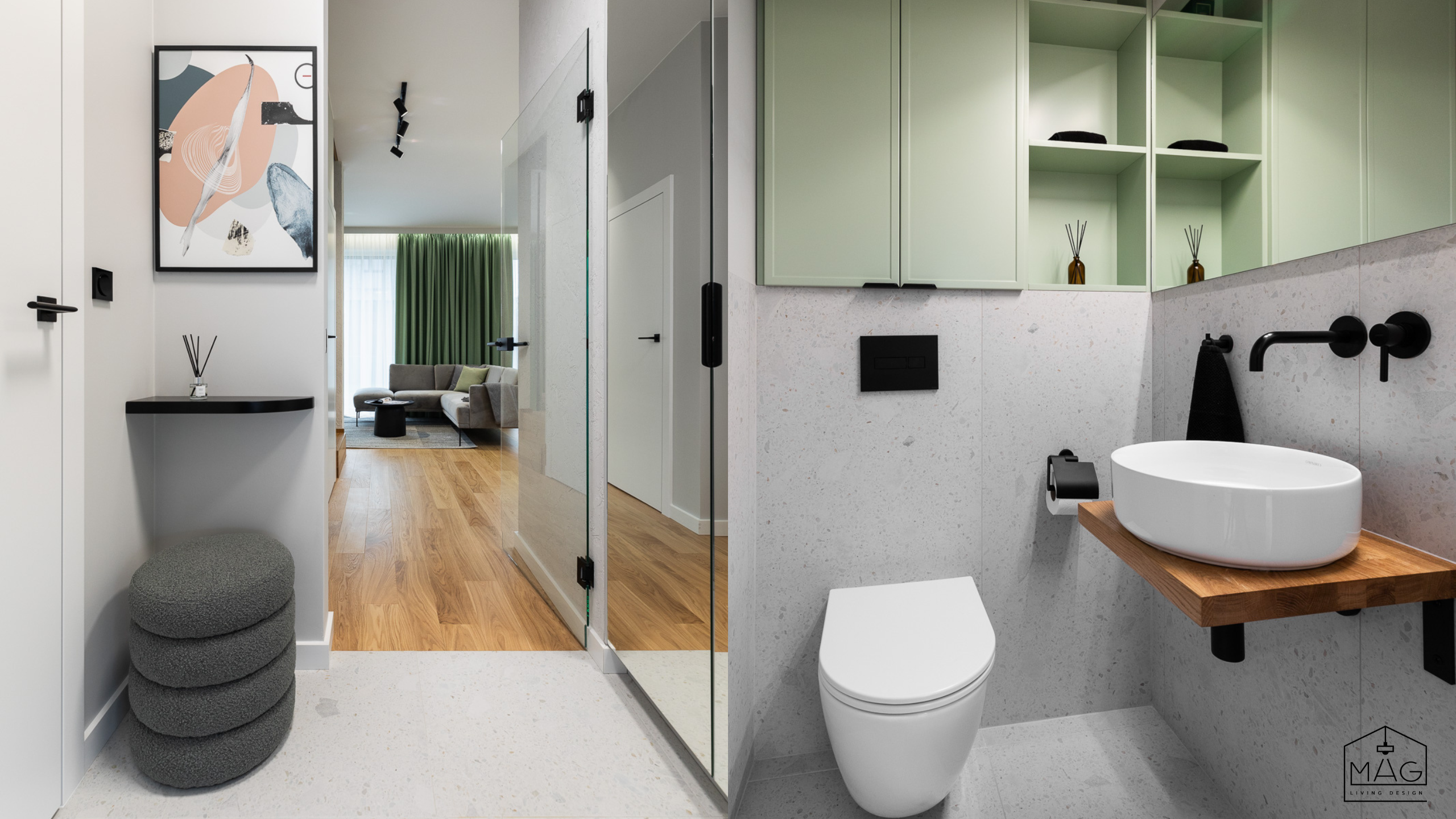 Nowoczesne i przytulne wnętrze bliźniaka (90 m²) stworzone z myślą o wynajmie. Połączenie ciepłych odcieni drewna, szałwii i szarości nadaje aranżacji harmonijny i uniwersalny charakter. Wysokiej jakości materiały, eleganckie blaty z konglomeratu oraz strukturalne tynki ścienne podkreślają dopracowany styl. Nastrojowe oświetlenie LED dodaje głębi i nowoczesnego akcentu. Modnie, ale neutralnie – idealnie dopasowane do szerokiego grona najemców.